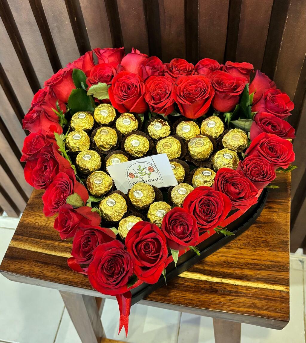 Caja de corazón, elaborada con 24 rosas y 24 ferreros.
